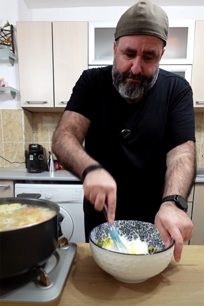 Celebrul bucătar cunoscut drept Bărbosu a prezentat această rețetă într-un clip care a devenit rapid popular pe internet. Varianta sa de ciorbă păstrează baza clasică a preparatului românesc, dar introduce câteva elemente inspirate din bucătăria grecească, care schimbă complet textura și gustul final.
