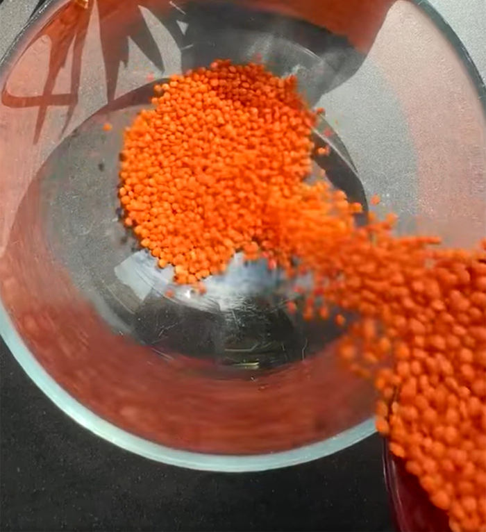 Primul pas este hidratarea. Pune lintea roșie într-un bol și acoper-o cu apă. Las-o la înmuiat aproximativ 3 ore. În acest timp, boabele se vor umfla și se vor înmuia suficient pentru a putea fi transformate într-o pastă fină.