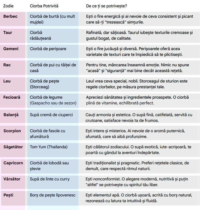 Alegerea unei ciorbe în funcție de zodie nu este un simplu joc, ci o asociere inspirată de temperamentul, energia și nevoile emoționale ale fiecărui semn zodiacal. Unele zodii au nevoie de gusturi intense, picante sau consistente, care să le dea forță și vitalitate, în timp ce altele caută mâncăruri blânde, tradiționale, care oferă liniște și confort. Pe baza acestor trăsături, am realizat un tabel care leagă fiecare zodie de ciorba care i se potrivește cel mai bine.