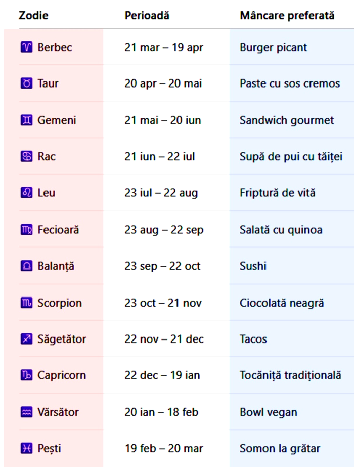 Pornind strict de la informațiile din tabel, iată care este mâncarea asociată fiecărei zodii și ce spune aceasta despre tine.