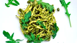 2. Se prepară sosul verde: busuiocul și rucola se toacă și se mixează cu ulei de măsline într-un blender, până devin o cremă aromată.