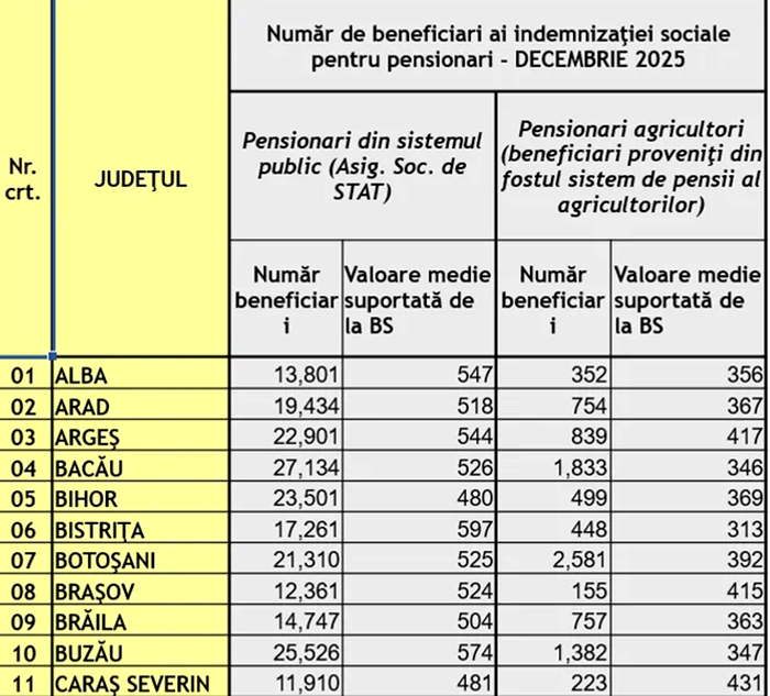 Conform datelor oficiale privind numărul de beneficiari ai indemnizației sociale pentru pensionari din decembrie 2025, publicate în mai multe rapoarte statistice, există județe în care pensionarii primesc medii de peste 526 lei pe lună în plus față de pensia de stat.